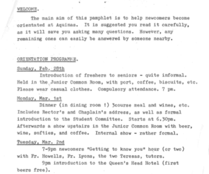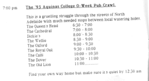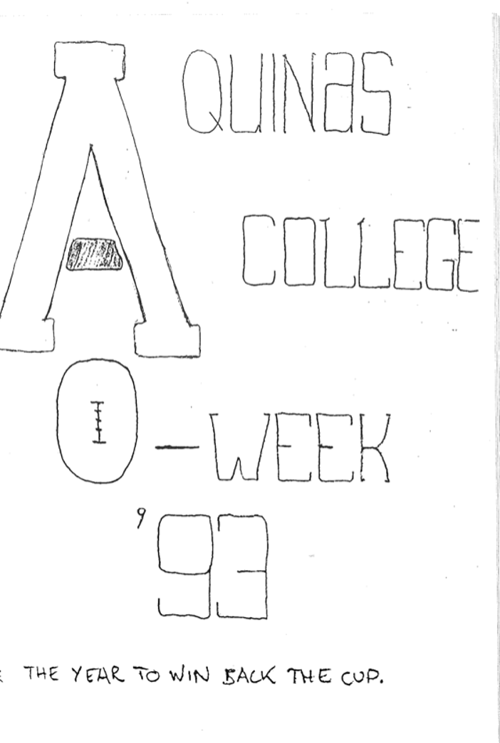Needless to say, much has changed since O’Week 1993: most days in the current O’Week are non-drinking, and even then, half the pubs that used to be on the O’Week Pub Crawl have, like the Darling Cellar, been closed down. Happily, if the paper goes into the printer crooked nowadays, it self-corrects, rather than presenting a Pub Crawl program on an angle. Whatever the era however, the desire to ‘Win Back the Cup’ still burns bright in the heart of Aquinians, and, even if you still have questions, they will still be ‘easily answered by someone nearby.’ Once an Aquinian, always an Aquinian…
