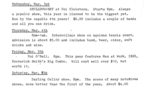 Coming to us fresh from the days of biro and photocopier publishing, the 1993 O’Week Guide is a masterpiece of dot matrix and vague costing. Starting from the thoughtful layout of the front cover, this guide demonstrates some of the artist’s best block lettering. While the early part of the program is fairly straightforward, the reader is encouraged to keep going to the bigger uni events towards the end of the week…